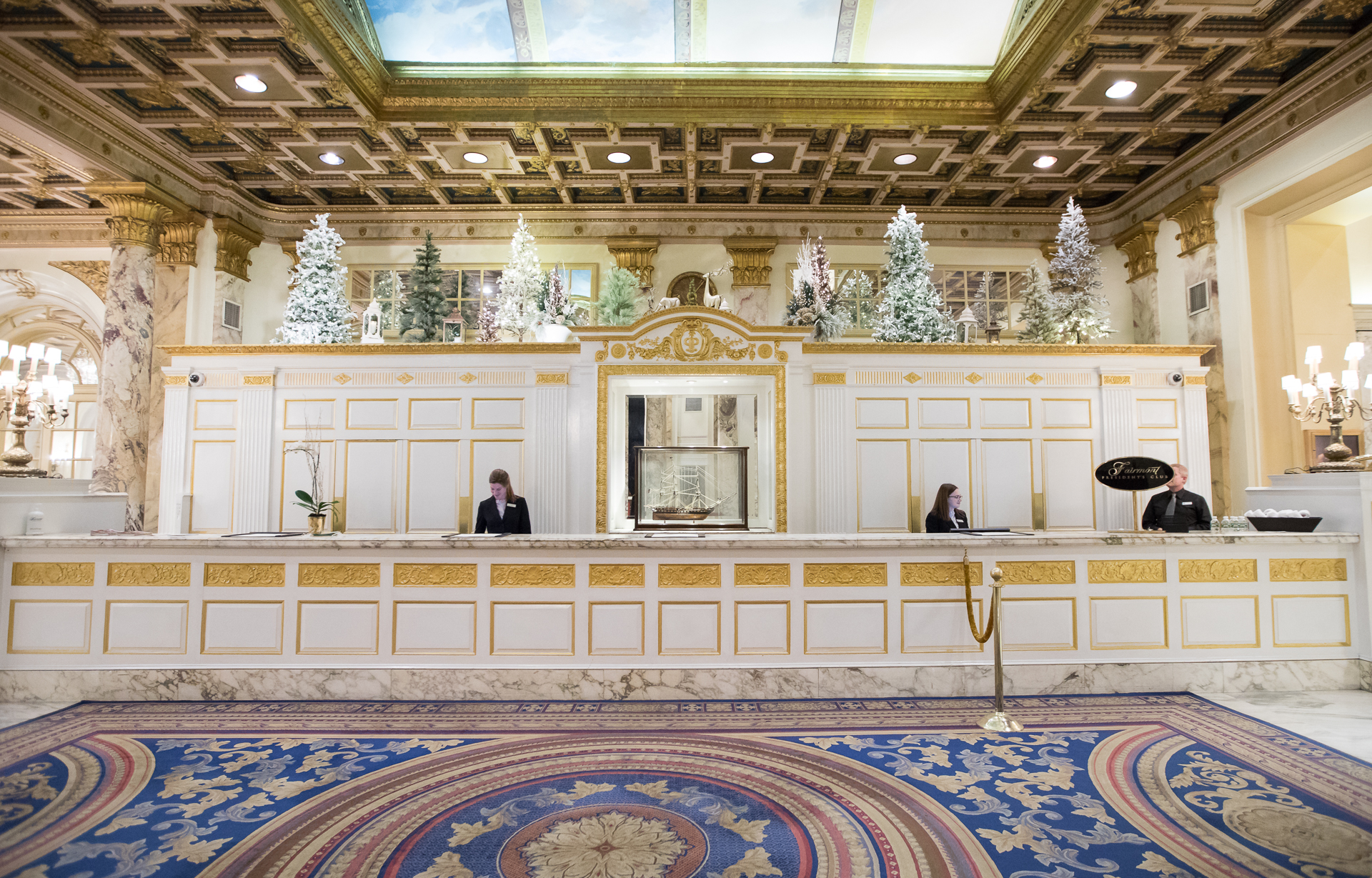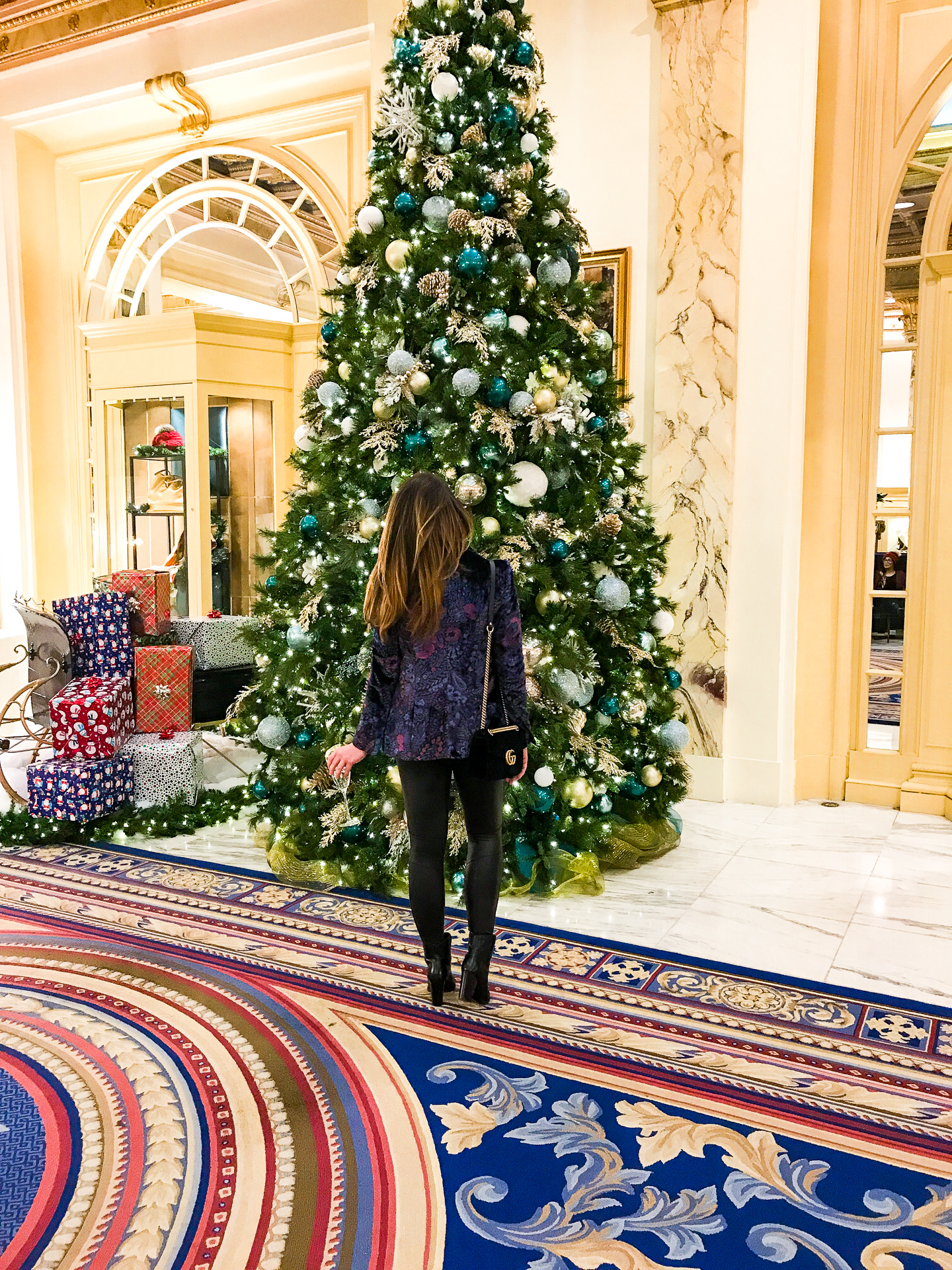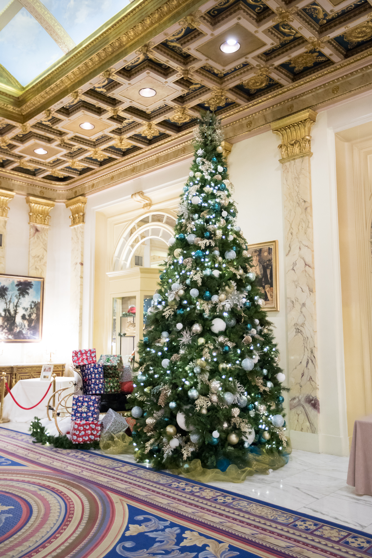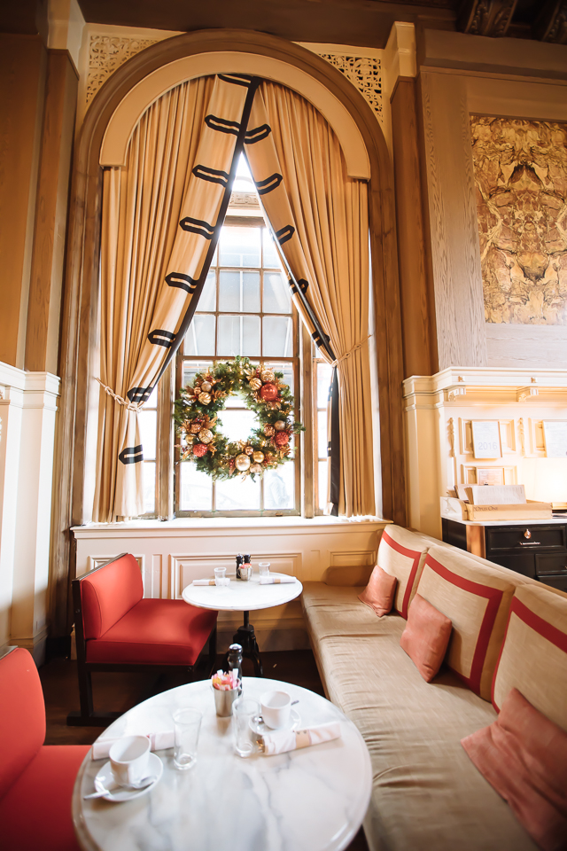 The Fairmont Copley Plaza is magical anytime of the year but its exceptional during the holidays! Its grand lobby holds a wintery scene behind check-in. A gingerbread replica of the hotel, and giant Christmas tree. Not to the mention the sled full of presents. The ballroom doors are flanked with elegant white poinsettias on golden pedestals. Their restaurant, Oak Long Bar & Kitchen,f with its natural wood tones complimented by soft blush and neutral fabrics, is adorned with wreaths to bright the holiday spirit. It is truly a special hotel for your stay to explore Boston!