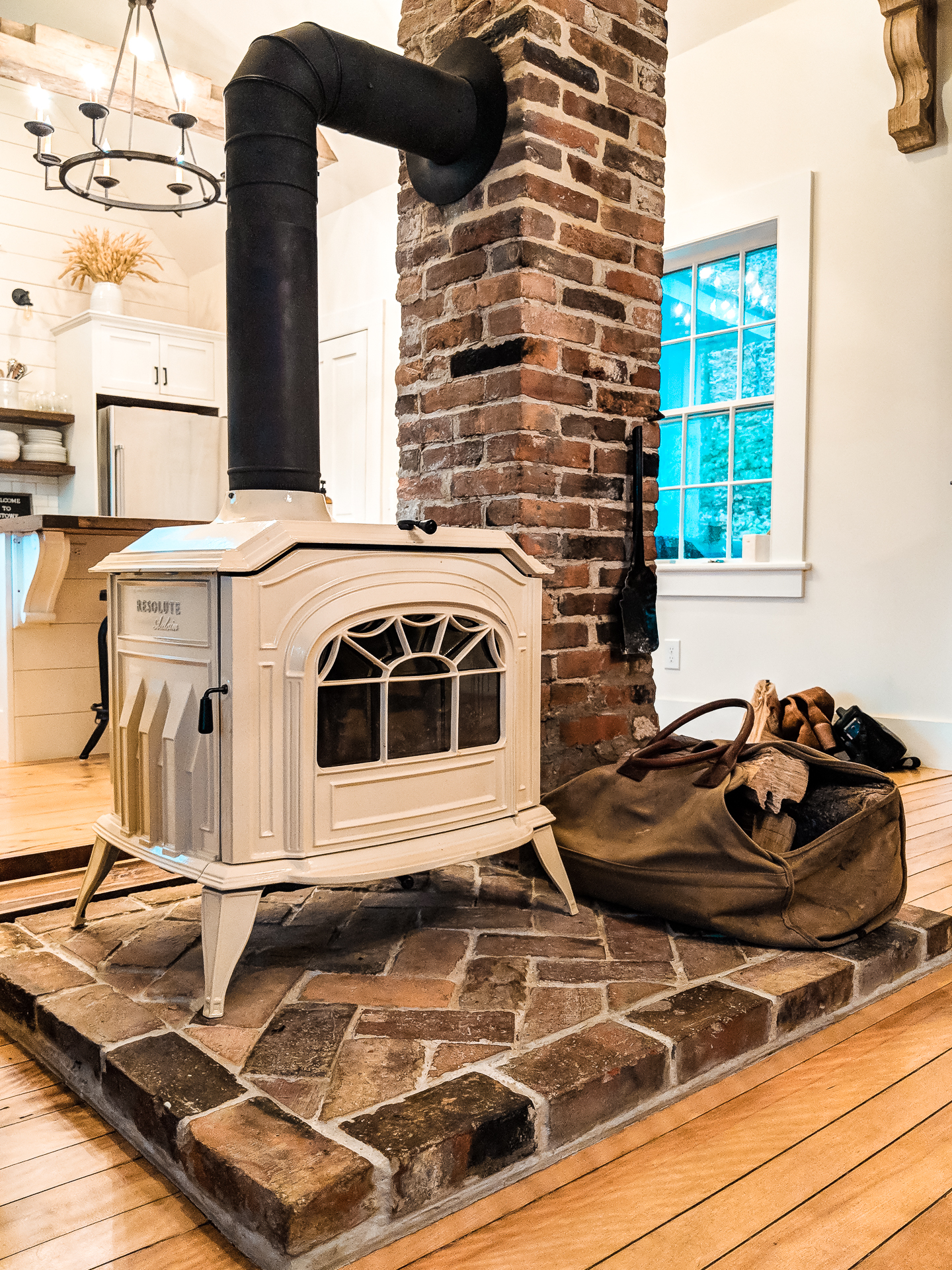 Just off the Farm Home’s kitchen is a mudroom, ideal location that has a setup that is perfect for those who want to come and ski Stowe’s famous slopes. A wood burning stove separates the dining + kitchen area with a charming natural brick chimney. The rustic farm table happily fills the dining space while seating 8, and is complimented by metal chairs and a metal light fixture.