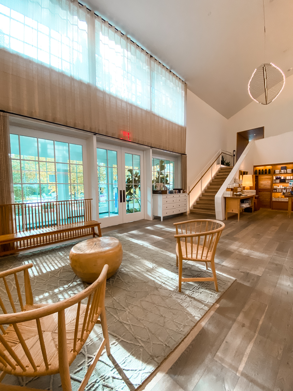 The Woodstock Inn Spa is a 10,000 square foot LEED certified facility teeming with natural light that is accentuated by floor to ceiling windows. They use locally sourced products {notice the glass lights – Simon Pearce} and they have 10 treatment rooms.
