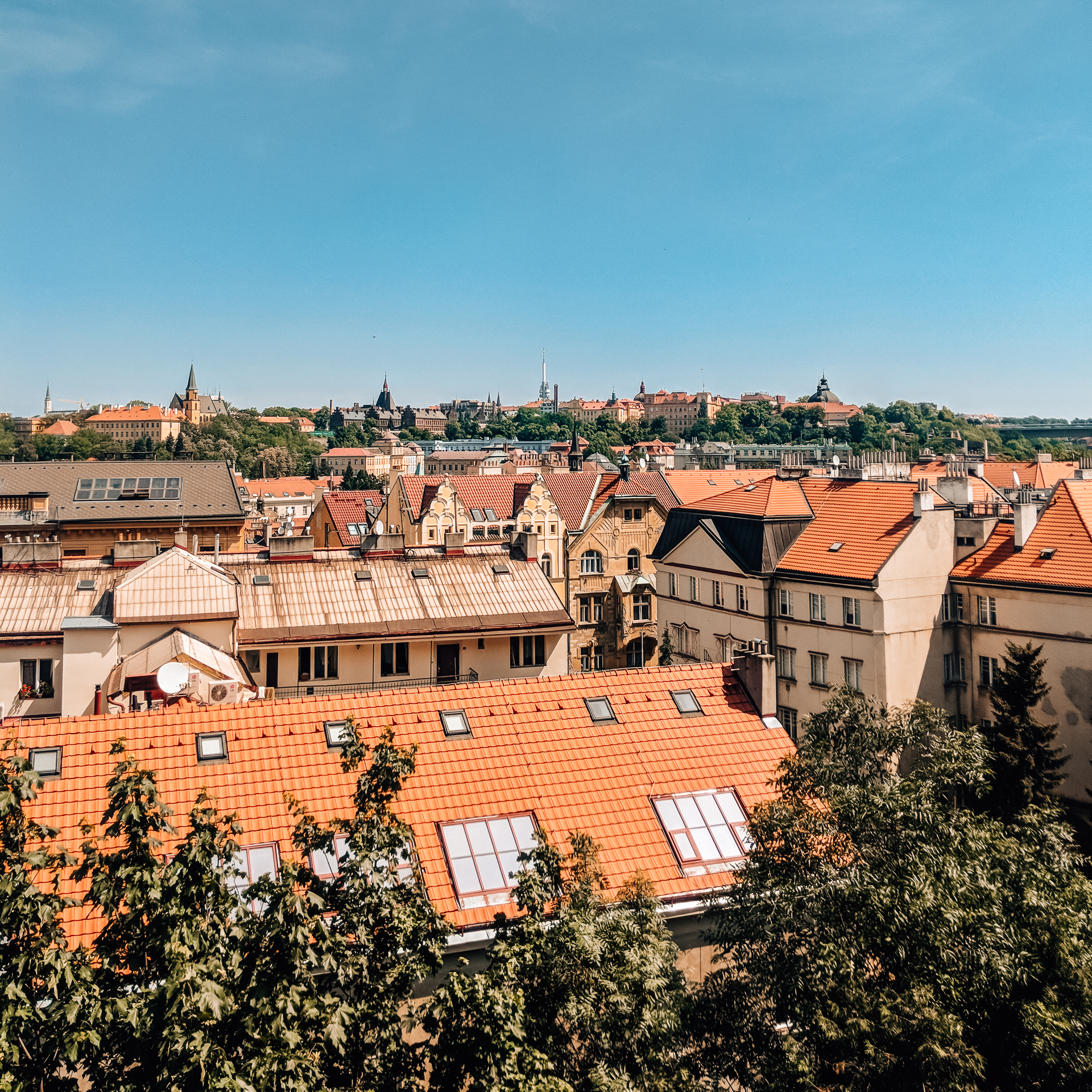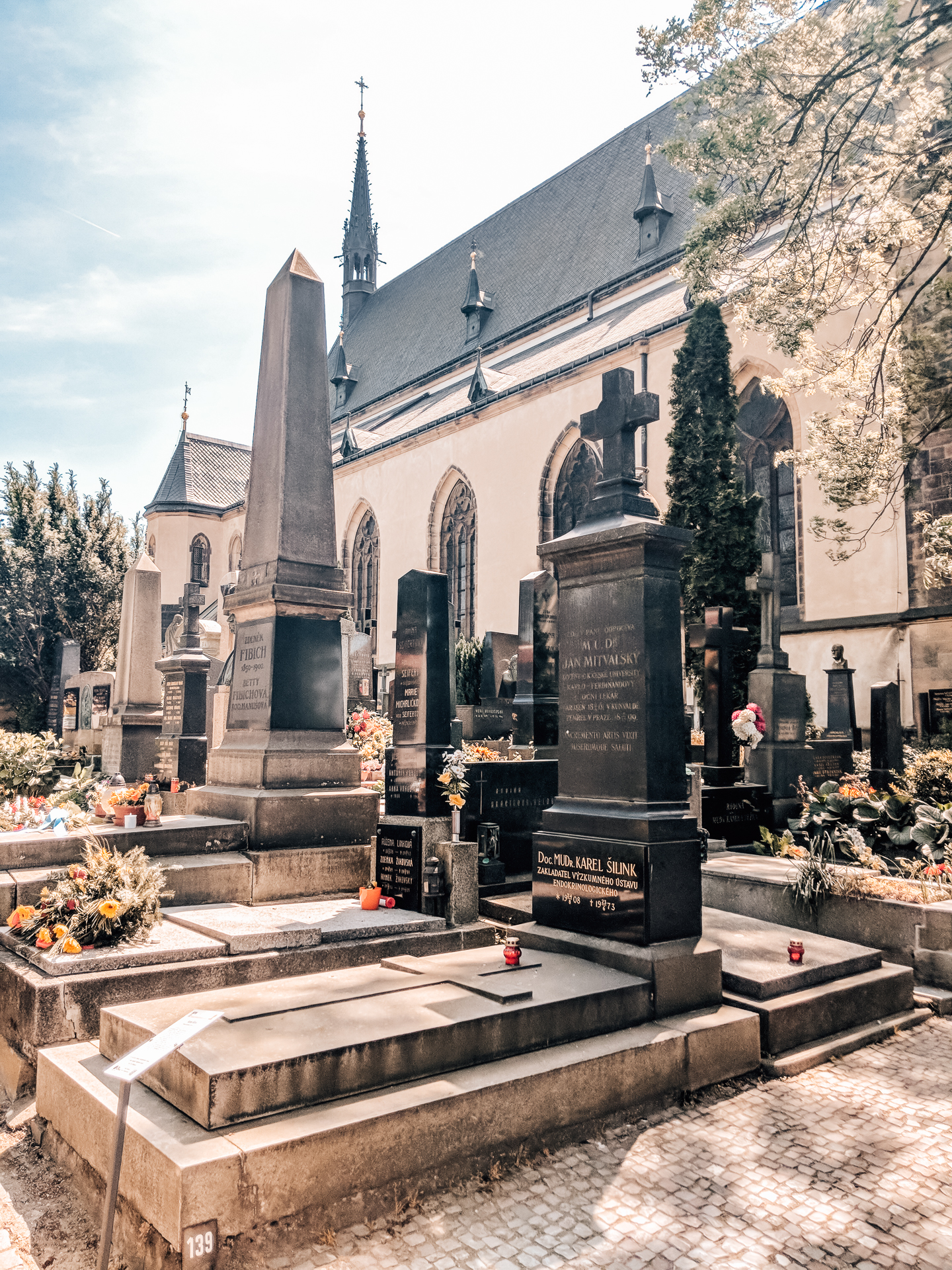 Located in front of Vseyhrad Cemetary is the Basilica of St. Peter and St. Paul. A stunning example of Neo-Gothic architecture with two soaring towers. The entry ways are decorated in pink and blue ornamental tiles. It is a gorgeous church to visit while in Prague!